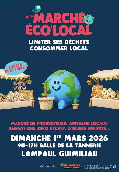 Retour liste Accueil >Animations >Marché Éco’local Marché Éco’local Lampaul-Guimiliau Marché de producteurs, artisans locaux, animations zéro déchets, ateliers enfants … Dates et heures de l’événement – Le dimanche 1 mars 2026 de 09:00 à 17:00 Localisation Salle de la Tannerie Lampaul-Guimiliau Tel. 06 99 55 70 00 mjp.asso.lampaul@gmail.com Ajouter au carnetRetirer du carnet Itinéraire – Accès À proximité