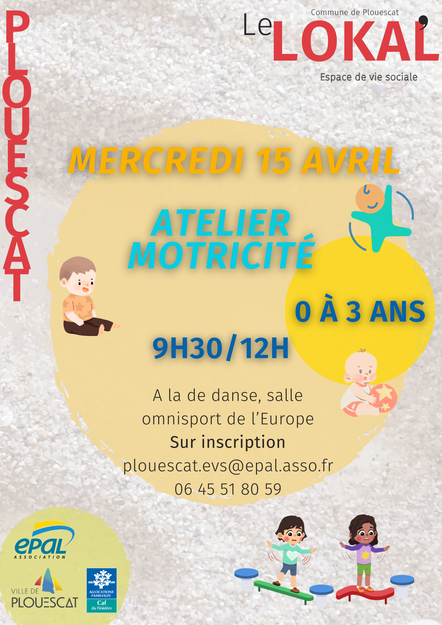 Retour liste Accueil >Animations >Motricité Motricité Plouescat Atelier motricité parent/enfant. Sur inscription de 0 à 3 ans. Dates et heures de l’événement – Le mercredi 15 avril 2026 de 09:30 à 12:00 Localisation Salle de danse Place de l’Europe Plouescat Tel. 06 45 51 80 59 plouescat.evs@epal.asso.fr Site internet Ajouter au carnetRetirer du carnet Itinéraire – Accès À proximité