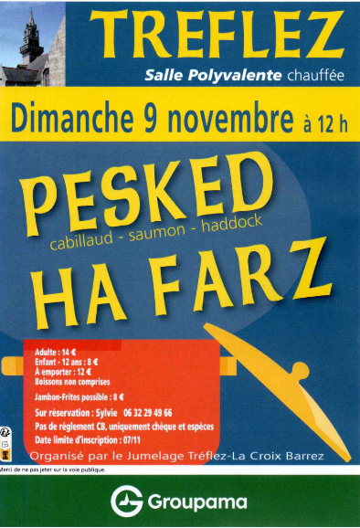 Pesked ha Farz (cabillaud-saumon-haddock) organisé par le comité de jumelage Tréflez – La croix Barrez. Boissons non comprises. Jambon-Frites possible. Sur réservation ou à emporter. Date limite d’inscription : le 07 novembre.