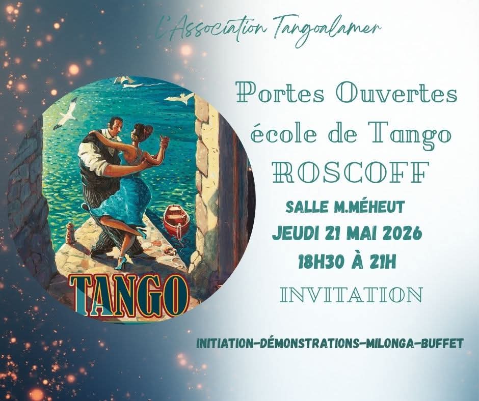 Retour liste Accueil >Animations >Portes ouvertes école de Tango Roscoff Portes ouvertes école de Tango Roscoff Roscoff Portes ouvertes de l’école de Tango de Roscoff avec initiation, démonstration, milonga et buffet. Dates et heures de l’événement – Le jeudi 21 mai 2026 de 18:30 à 21:00 Localisation Espace Mathurin Méheut Place de la Gare Roscoff Ajouter au carnetRetirer du carnet Itinéraire – Accès À proximité