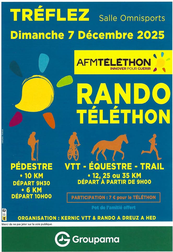 Kernic VTT & Rando A Dreuz A Hed vous donnent rendez-vous à partir de 9h pour des randonnées en faveur du Téléthon !
