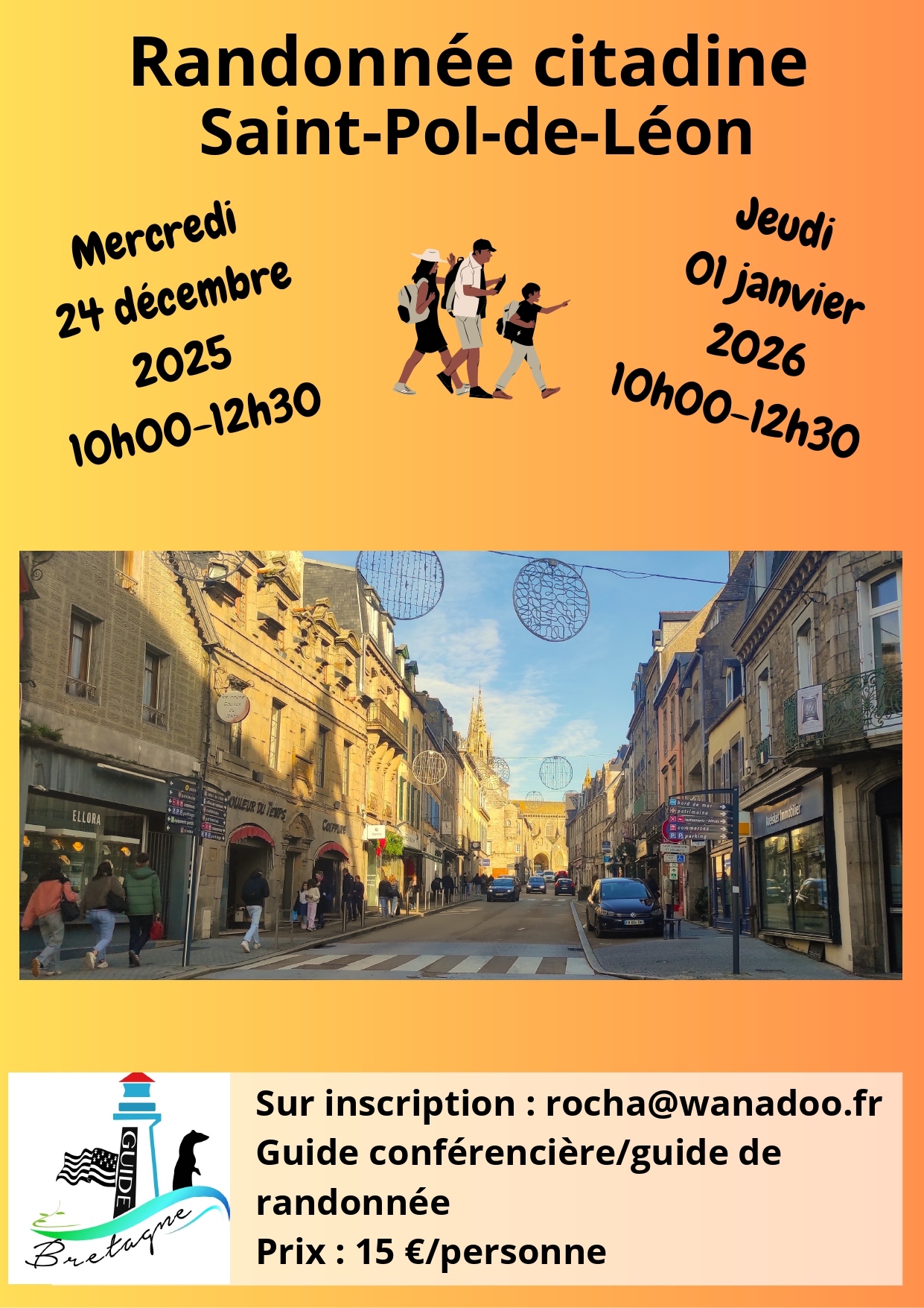 Randonnée citadine guidée dans la ville de Saint-Pol-de-Léon réalisée par une guide conférencière/ de randonnée de l’association LAGAD TOURISME. C’est une association de guides professionnels, tous titulaires de la carte de guide conférencier, travaillant essentiellement dans le nord Finistère. Sur réservation.
