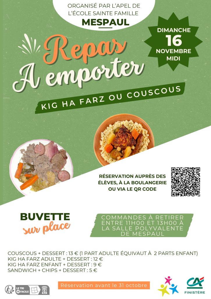 L’APEL de l’école Sainte Famille organise un repas à emporter afin de financer les projets de l’école.
