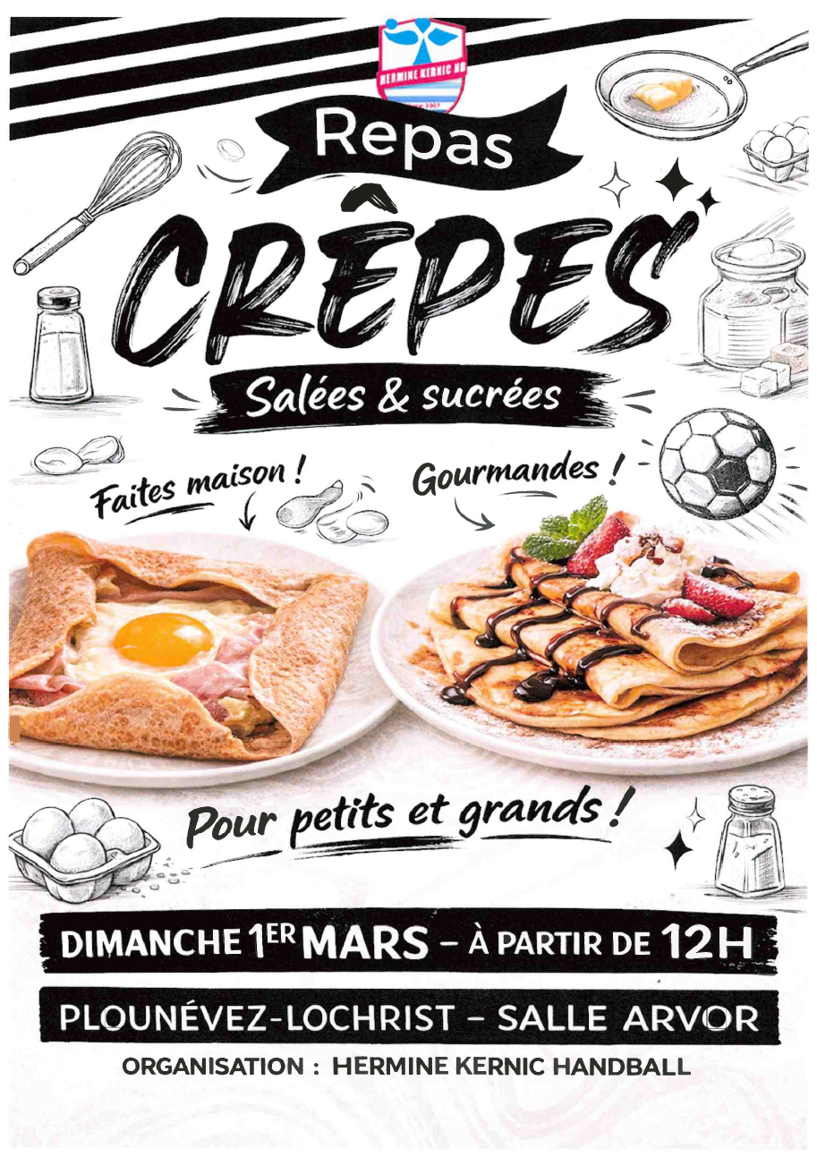 Retour liste Accueil >Animations >Repas crêpes du club de handball Repas crêpes du club de handball Plounévez-Lochrist Comme chaque année, le club de handball de l’Hermine Kernic organise son traditionnel repas crêpes pour la chandeleur. Nous vous attendons donc nombreux pour venir déguster nos délicieuses crêpes sucrées et salées ! Dates et heures de l’événement – Le dimanche 1 mars 2026 à 12:00 Localisation Salle Arvor Rue de Bellevue Plounévez-Lochrist Tel. 06 62 69 58 12 Ajouter au carnetRetirer du carnet Itinéraire – Accès À proximité