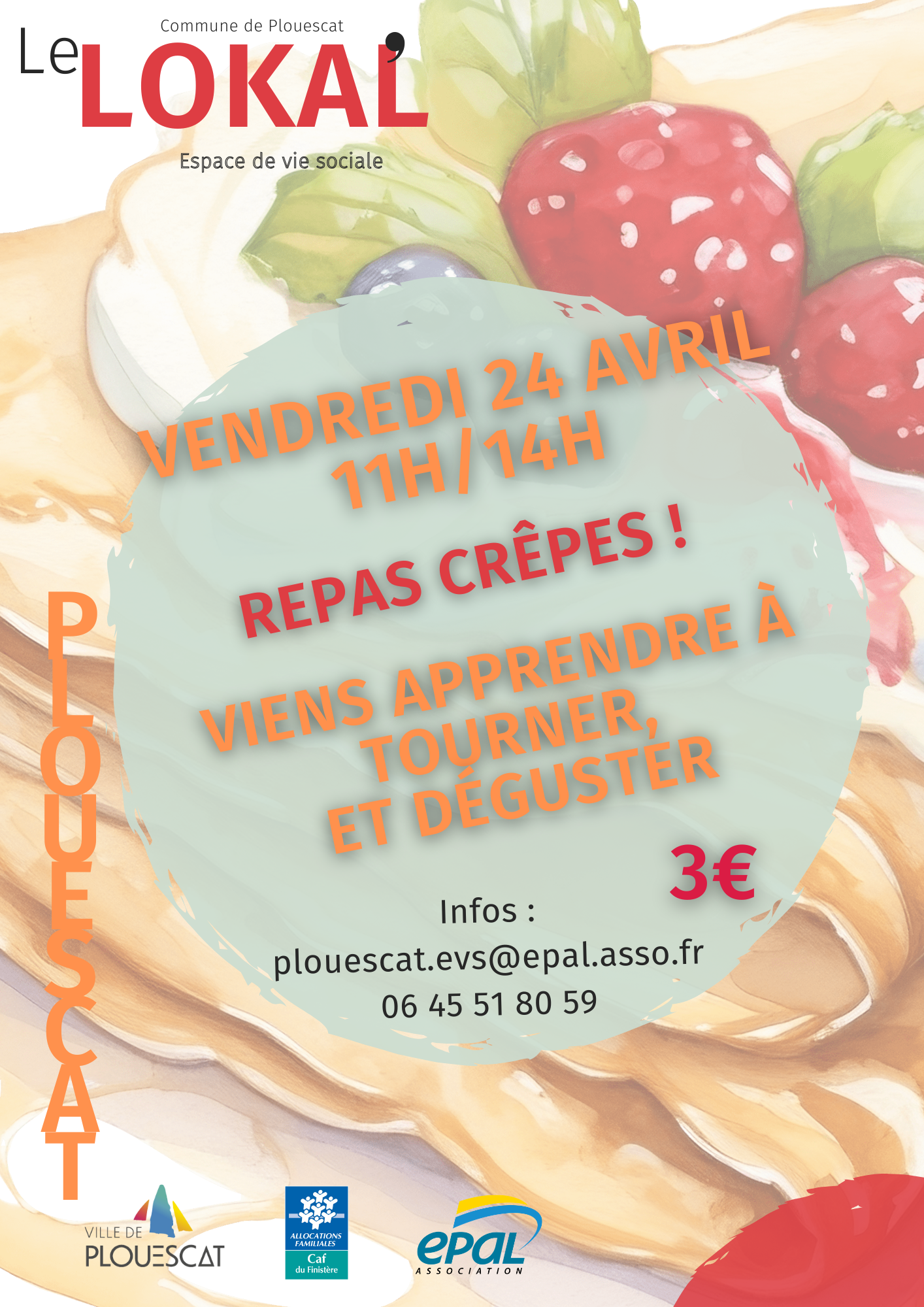 Retour liste Accueil >Animations >Repas crêpes Repas crêpes Plouescat 3€ Viens apprendre à tourner, et déguster. Dates et heures de l’événement – Le vendredi 24 avril 2026 de 11:00 à 14:00 Tarifs Tarif de base : 3,00 € (Ouvert à tous) Localisation Le Lokal, espace de vie sociale Rue des Sports Plouescat Tel. 06 45 51 80 59 plouescat.evs@epal.asso.fr Site internet Ajouter au carnetRetirer du carnet Itinéraire – Accès À proximité