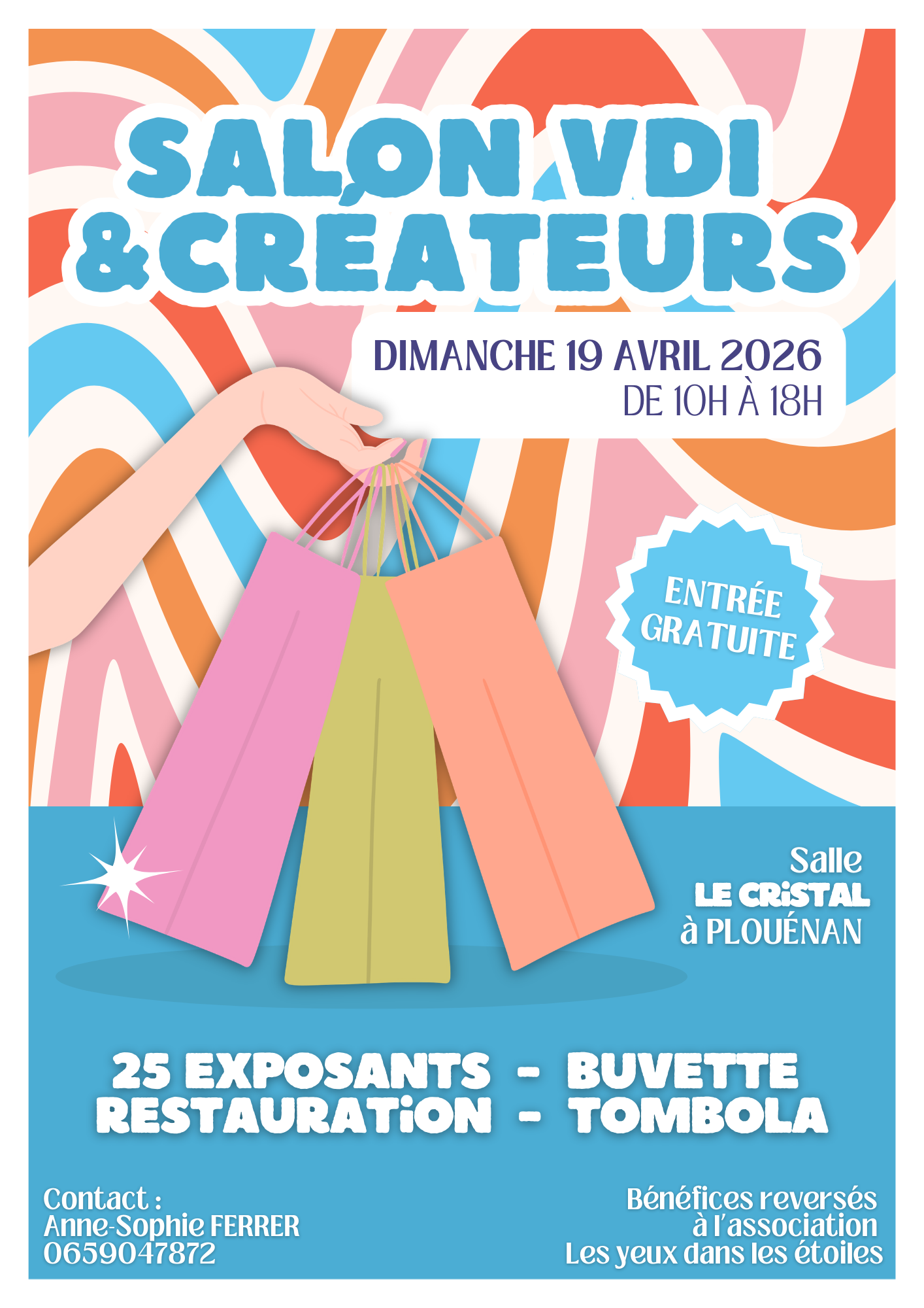 Venez nombreux au premier salon VDI & Créateurs de Plouénan. 25 exposants, une tombola, buvette et petite restauration sur place. Les bénéfices de l’organisation seront reversés à l’association « Les yeux dans les étoiles » créé par Leïla & Erwan Bars.