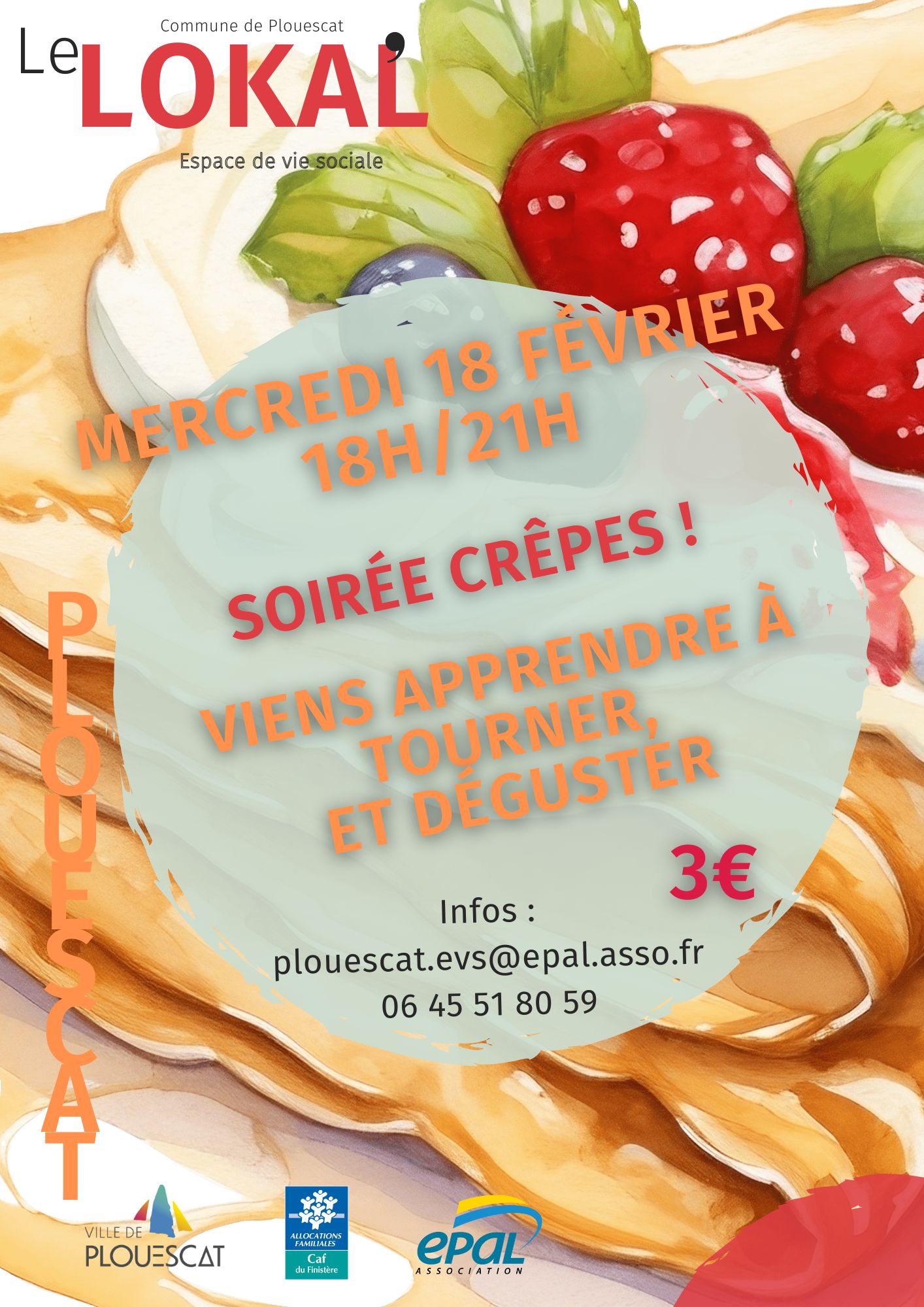 Retour liste Accueil >Animations >Soirée crêpes Soirée crêpes Plouescat 3€ Fabrication de crêpes et repas partagé ! On apprend à tourner et on mange ensemble.À partir de 6 ans, ouvert à tous sur inscription. Dates et heures de l’événement – Le mercredi 18 février 2026 de 18:00 à 21:00 Tarifs Tarif de base : à partir de 3,00€ Localisation Le Lokal 5 parc des Sports Plouescat Tel. 06 45 51 80 59 plouescat.evs@epal.asso.fr Site internet Ajouter au carnetRetirer du carnet Itinéraire – Accès À proximité