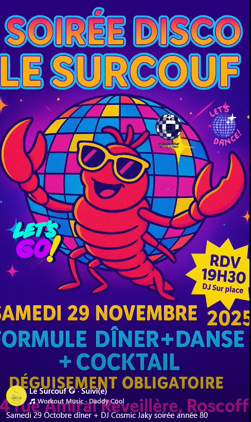 Retour liste Accueil >Animations >Soirée Disco Soirée Disco Roscoff Pour animer votre soirée, le Surcouf propose une soirée années 80 : Dîner, Danse et cocktail avec Cosmic DJ.Déguisement obligatoire ! Dates et heures de l’événement – Le samedi 29 novembre 2025 à 19:30 Localisation Le Surcouf Restaurant 14 Rue Amiral Réveillère Roscoff Tel. 02 98 69 71 89 Ajouter au carnetRetirer du carnet Itinéraire – Accès À proximité