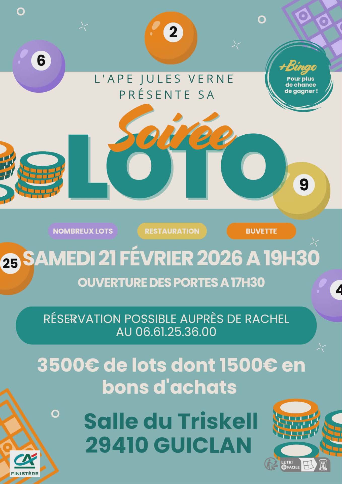 Retour liste Accueil >Animations >Soirée loto Soirée loto Guiclan Ouverture des portes à 17h30. + bingo. Réservations possibles auprès de Rachel au 06 61 25 36 00. 3500€ de lots et 1500e de bons d’achats. Restauration, buvette sur place. Organisé par l’APE Jules Vernes. Dates et heures de l’événement – Le samedi 21 février 2026 à 17:30 Localisation Salle du Triskell Guiclan Ajouter au carnetRetirer du carnet Itinéraire – Accès À proximité