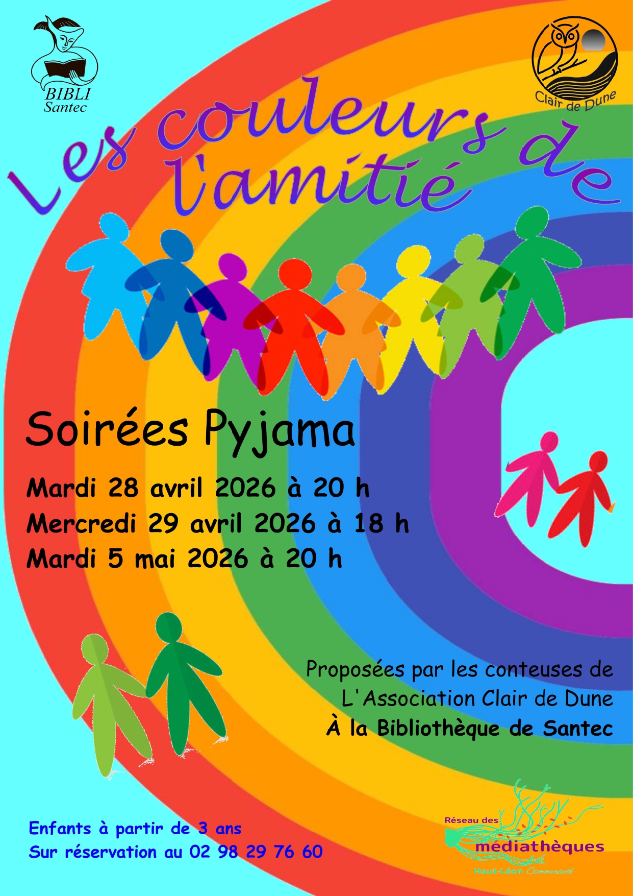 Les conteuses de l’association « Clair de Dune » vous invitent à leur nouveau spectacle soirées pyjamas qui sera présenté à la bibliothèque de Santec. Les inscriptions se feront à la bibliothèque de Santec aux heures d’ouverture