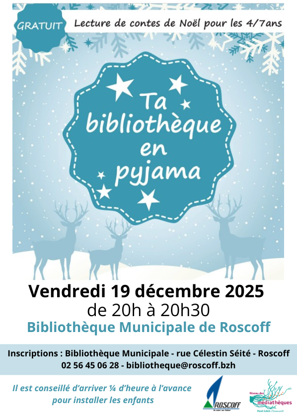 Retour liste Accueil >Animations >Ta bibliothèque en pyjama spéciale Noël Ta bibliothèque en pyjama spéciale Noël Roscoff Les 4-7 ans sont les grands invités de la bibliothèque pour une édition en pyjamas spéciale Noël.Sur inscription. Dates et heures de l’événement – Le vendredi 19 décembre 2025 de 20:00 à 20:30 Localisation Bibliothèque Rue Célestin Seite Roscoff Tel. 02 56 45 06 28 bibliotheque@roscoff.bzh Ajouter au carnetRetirer du carnet Itinéraire – Accès À proximité