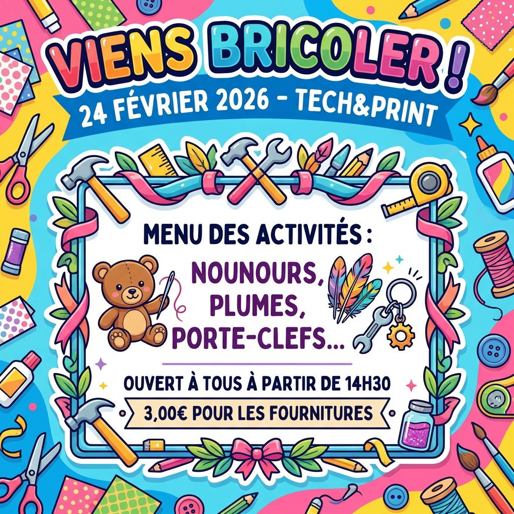 Retour liste Accueil >Animations >Tech&print : Viens bricoler ! Tech&print : Viens bricoler ! Plouescat 3€ Menu des activités : nounours, plumes, porte-clefs…Ouvert à tous !Payant (participation pour les fournitures). Dates et heures de l’événement – Le mardi 24 février 2026 à 14:30 Tarifs Tarif de base : à partir de 3,00€ Localisation 5 Rue Général Leclerc Plouescat Tel. 02 59 16 40 11 techprintcafe@proton.me Ajouter au carnetRetirer du carnet Itinéraire – Accès À proximité