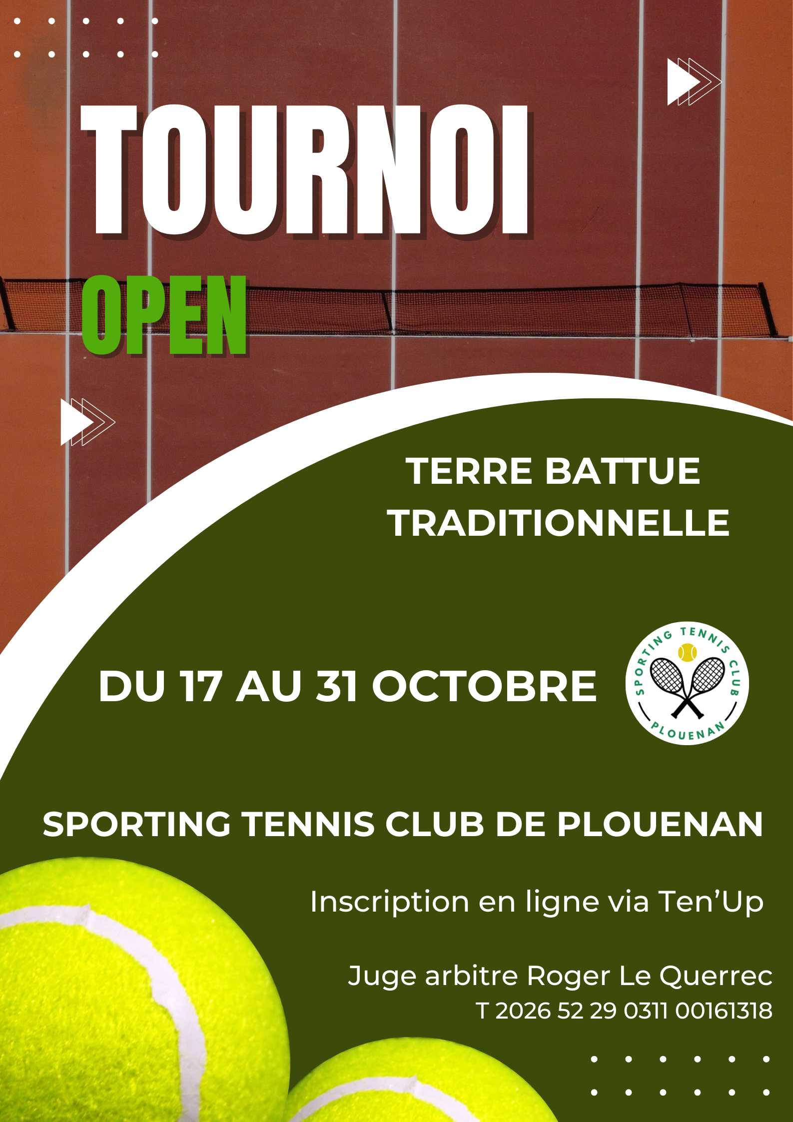 Retour liste Accueil >Animations >Tournoi de tennis Open Tournoi de tennis Open Plouénan 15€ Sur terre battue traditionnelle. Organisée par le Sporting Tennis Club de Plouénan.A partir de 14 ans licenciés à la FFT. Dates et heures de l’événement – Du vendredi 17 octobre 2025 au vendredi 31 octobre 2025 Tarifs Tarif de base : de 15,00€ à 19,00€ Localisation Tennis Club Taulé Plouénan Placenant Plouénan Tel. 06 48 29 14 04 Site internet Ajouter au carnetRetirer du carnet Itinéraire – Accès À proximité