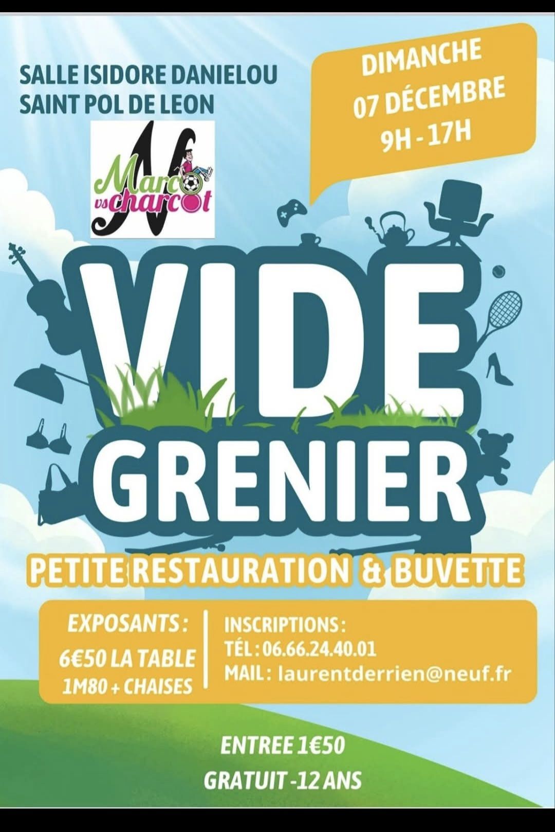 Retour liste Accueil >Animations >Vide grenier Vide grenier Saint-Pol-de-Léon 1.5€ Organisé par l’association Marco N.Petite restauration et buvette sur place.6,50€ la table de 1,80. Dates et heures de l’événement – Le dimanche 7 décembre 2025 de 09:00 à 17:00 Tarifs Tarif de base : 1,50 € (Gratuit moins de 12 ans) Localisation Salle Isidore Daniélou Avenue des Carmes Saint-Pol-de-Léon Tel. 06 66 24 40 01 laurentderrien@neuf.fr Ajouter au carnetRetirer du carnet Itinéraire – Accès À proximité