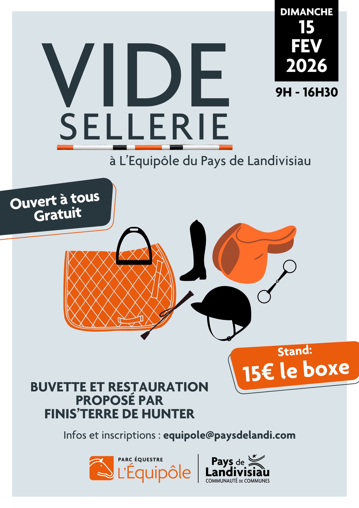 Retour liste Accueil >Animations >Vide-Sellerie Vide-Sellerie Plougourvest À l’occasion du concours organisé par Finis’terre de Hunter, l’Équipôle propose son tout premier vide-sellerie. Tarif : 15 € le box (11 m²). Buvette et restauration sur place. Ouvert à tous. Dates et heures de l’événement – Le dimanche 15 février 2026 de 09:00 à 16:30 Localisation Equipôle du Pays de Landivisiau 8 Quillivant Plougourvest equipole@paysdelandi.com Ajouter au carnetRetirer du carnet Itinéraire – Accès À proximité