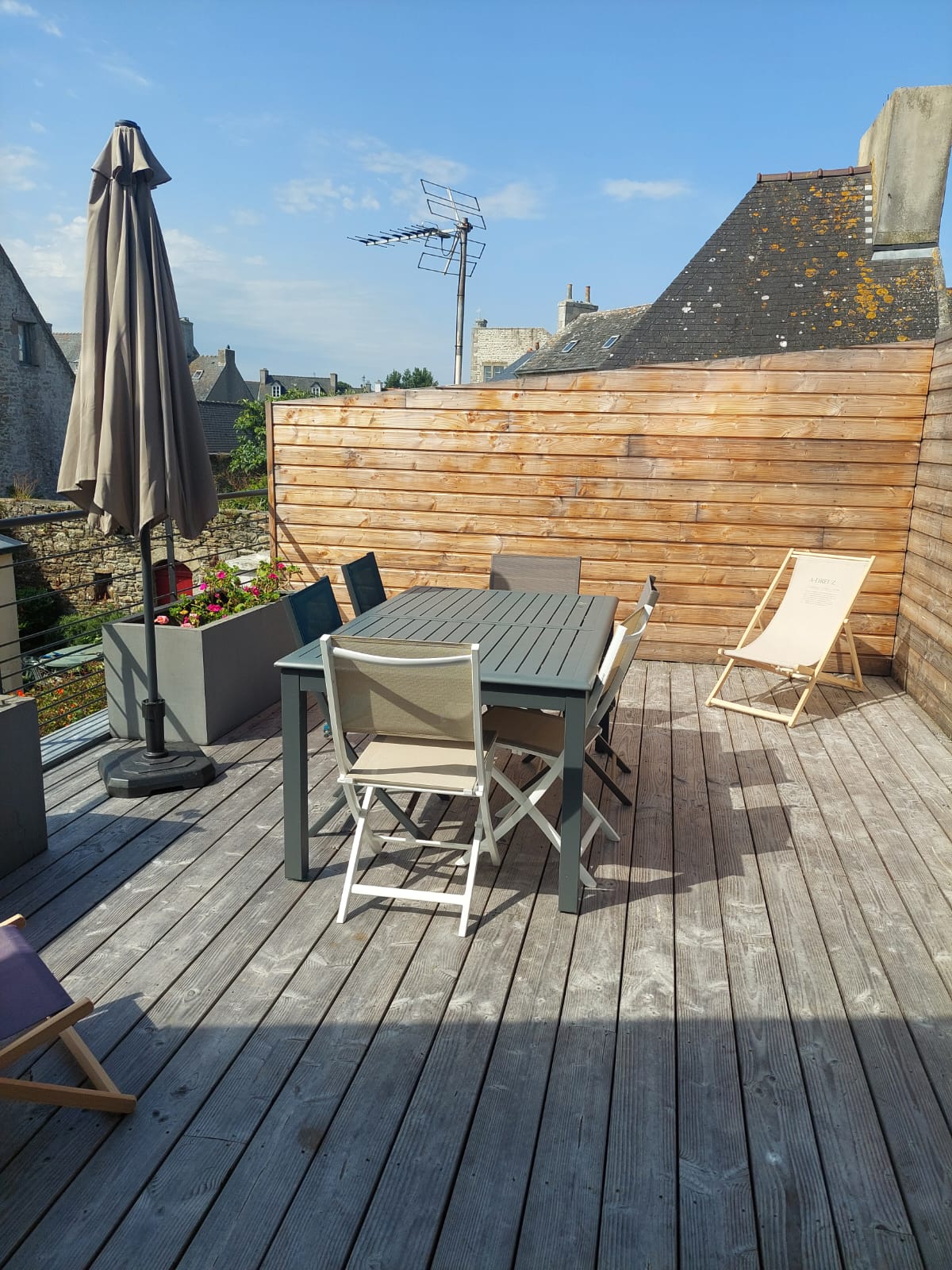 Dès l’entrée, vous découvrirez une cuisine ouverte entièrement équipée donnant accès à une agréable terrasse en bois.