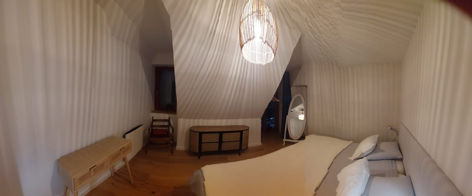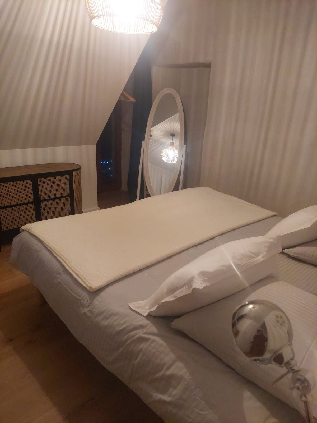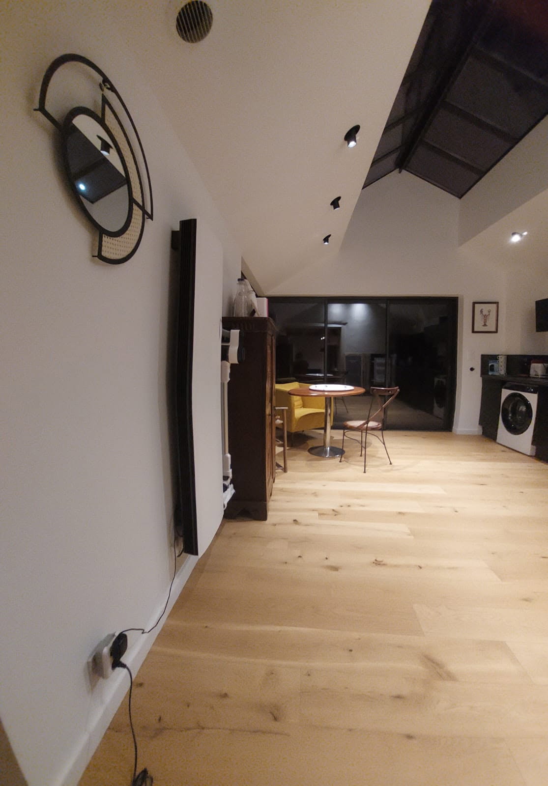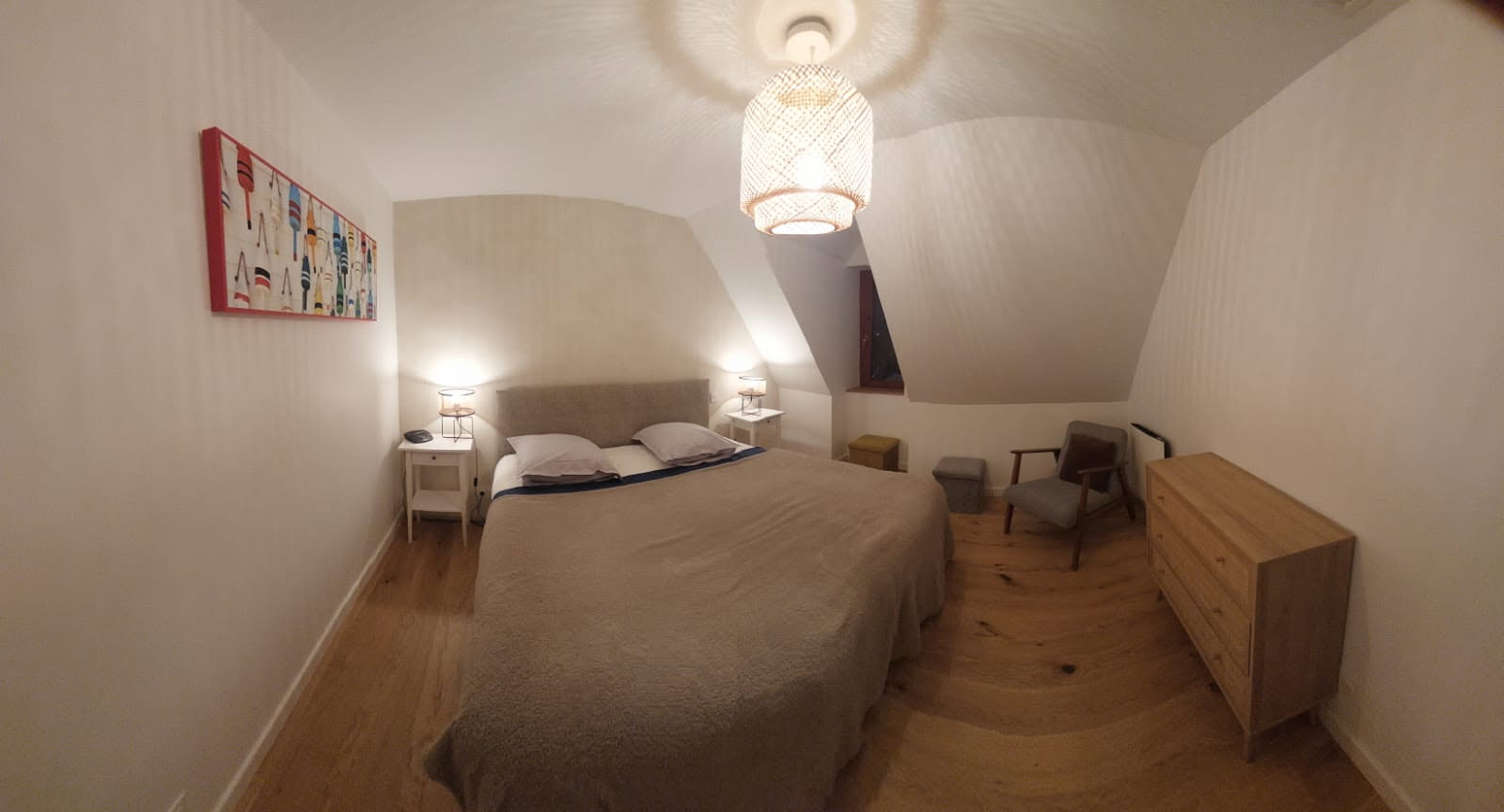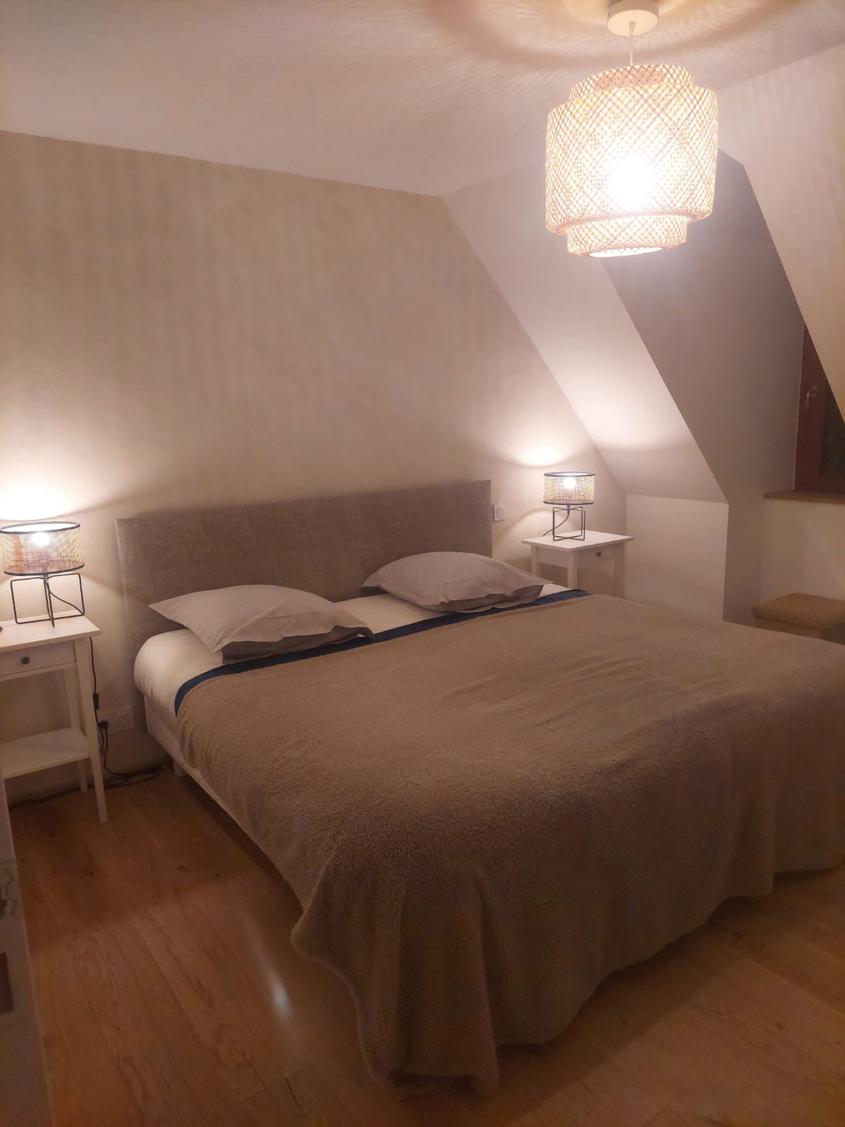 À l’étage, l’espace nuit se compose de deux chambres chacune équipée de deux lits 90×190 modulables pour s’adapter à vos besoins. Vous y trouverez également une salle d’eau avec WC.