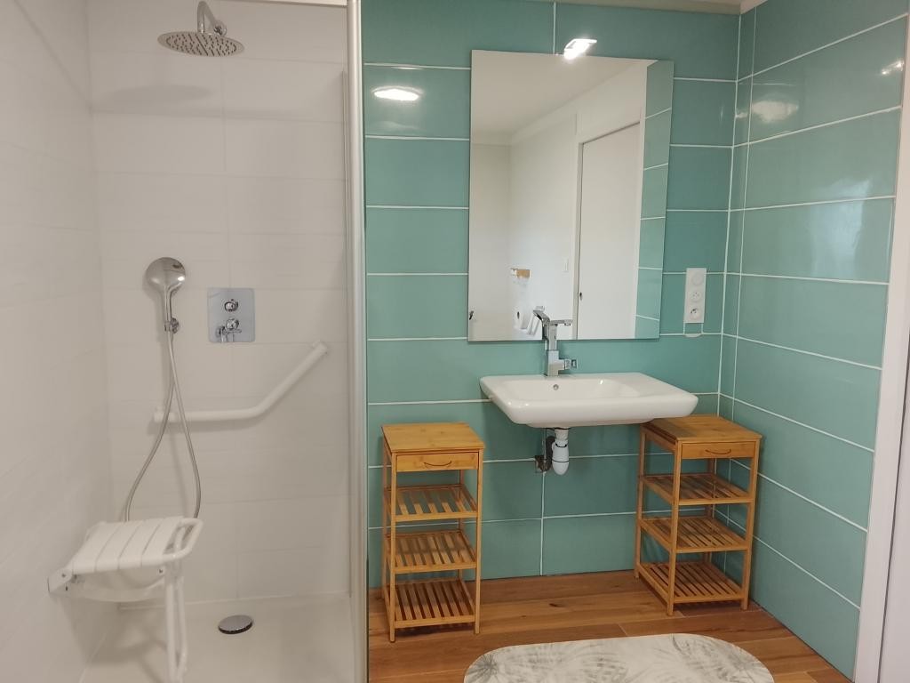 Le rez-de-chaussée, entièrement de plain-pied, est composé d’un séjour lumineux de 75m² avec sa cuisine toute équipée, d’une chambre avec salle de bain privative (baignoire + douche). La chambre et la douche sont accessibles aux Personnes à Mobilité réduites. WC indépendant. Buanderie avec un second réfrigérateur, lave-linge, séche-linge.