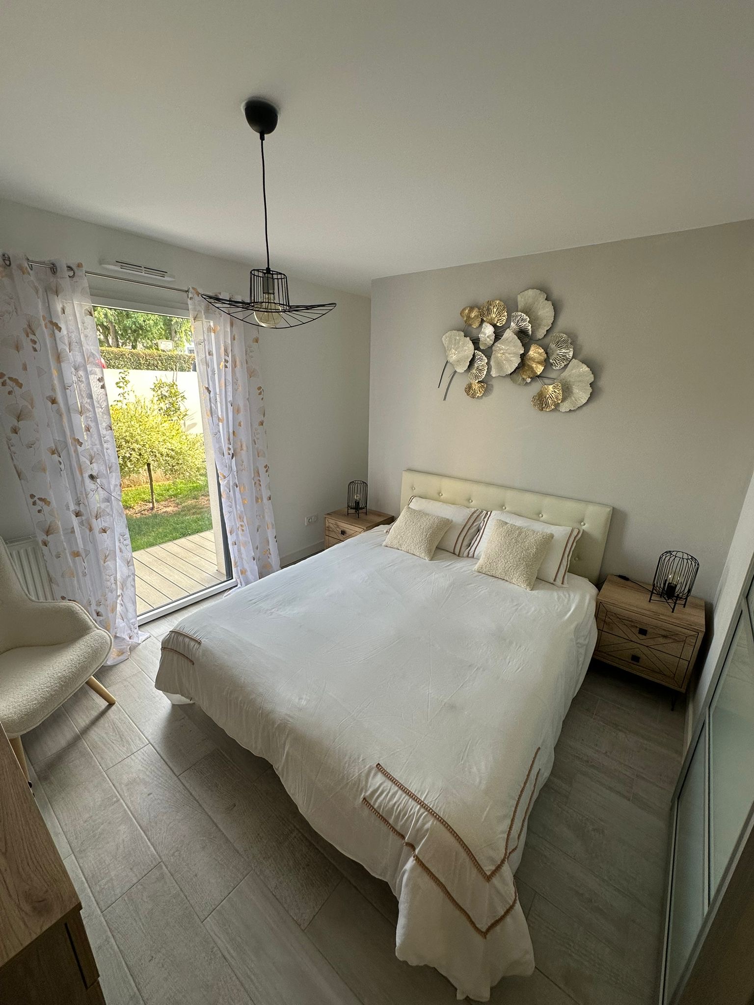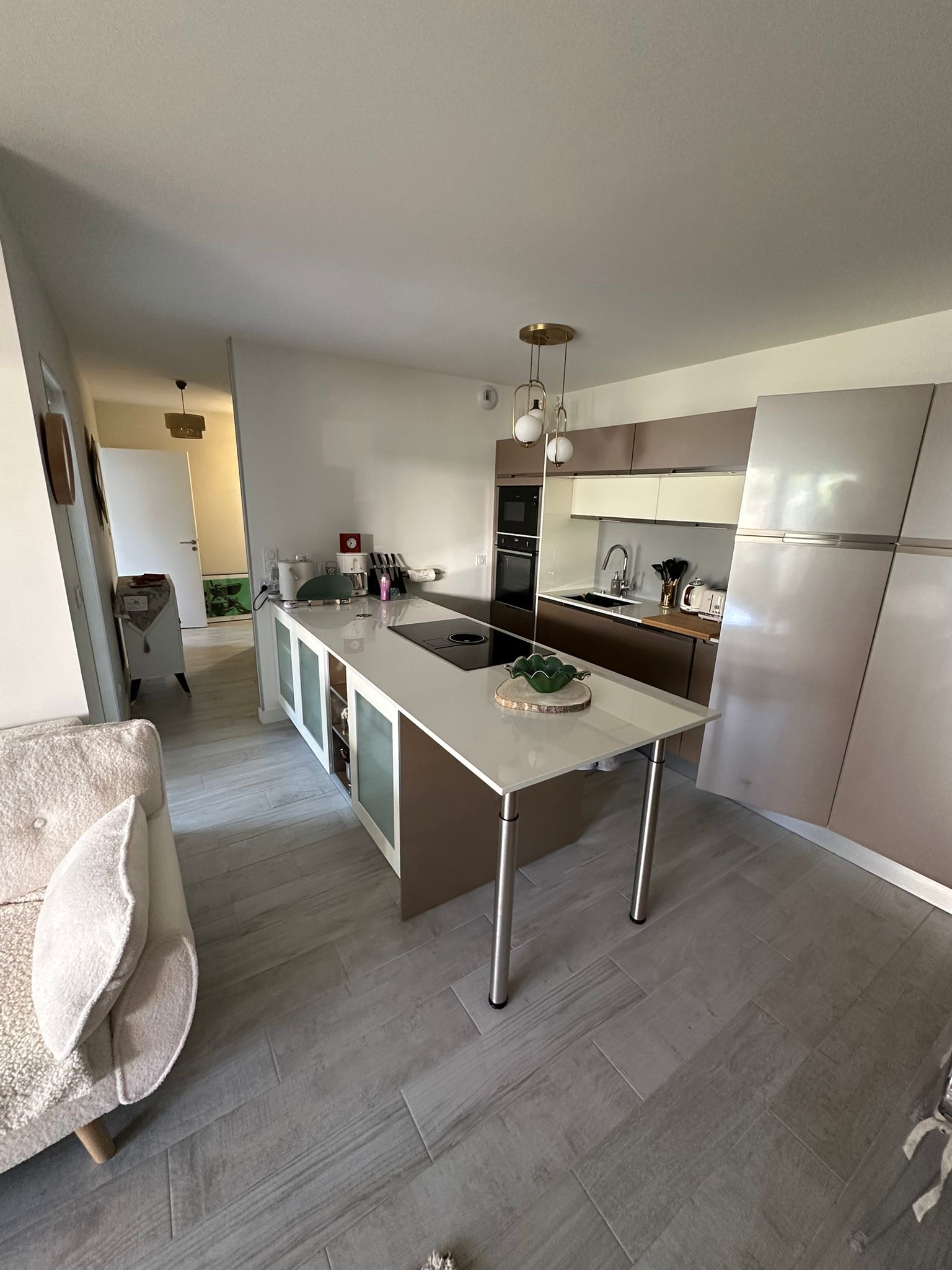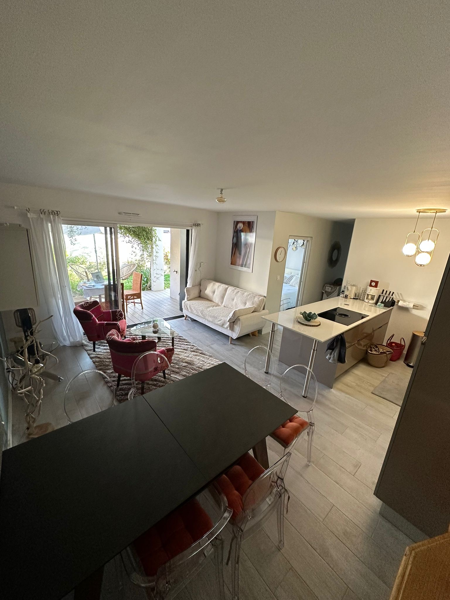 Le logement s’articule autour d ‘un salon donnant sur le jardin et ouvrant sur une cuisine lumineuse et spacieuse et bien équipée.