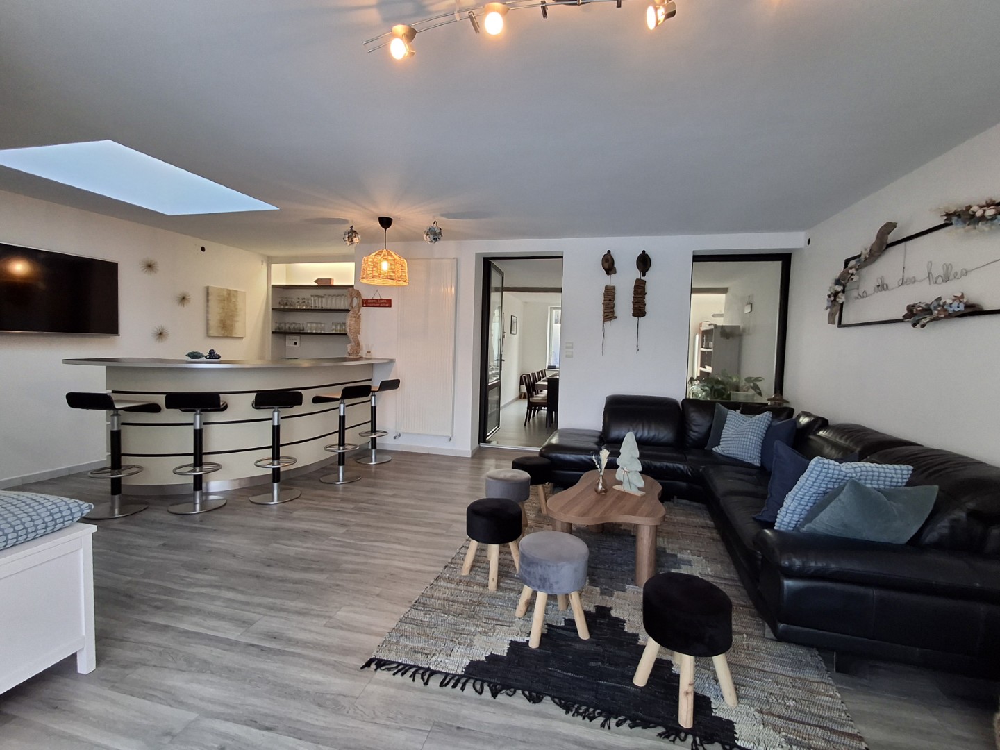La pièce à vivre, baignée de lumière, se compose d’un vaste espace repas, d’un bar professionnel pour vos soirées conviviales, et d’un salon cosy où vous retrouver autour d’un film ou d’un jeu de société.