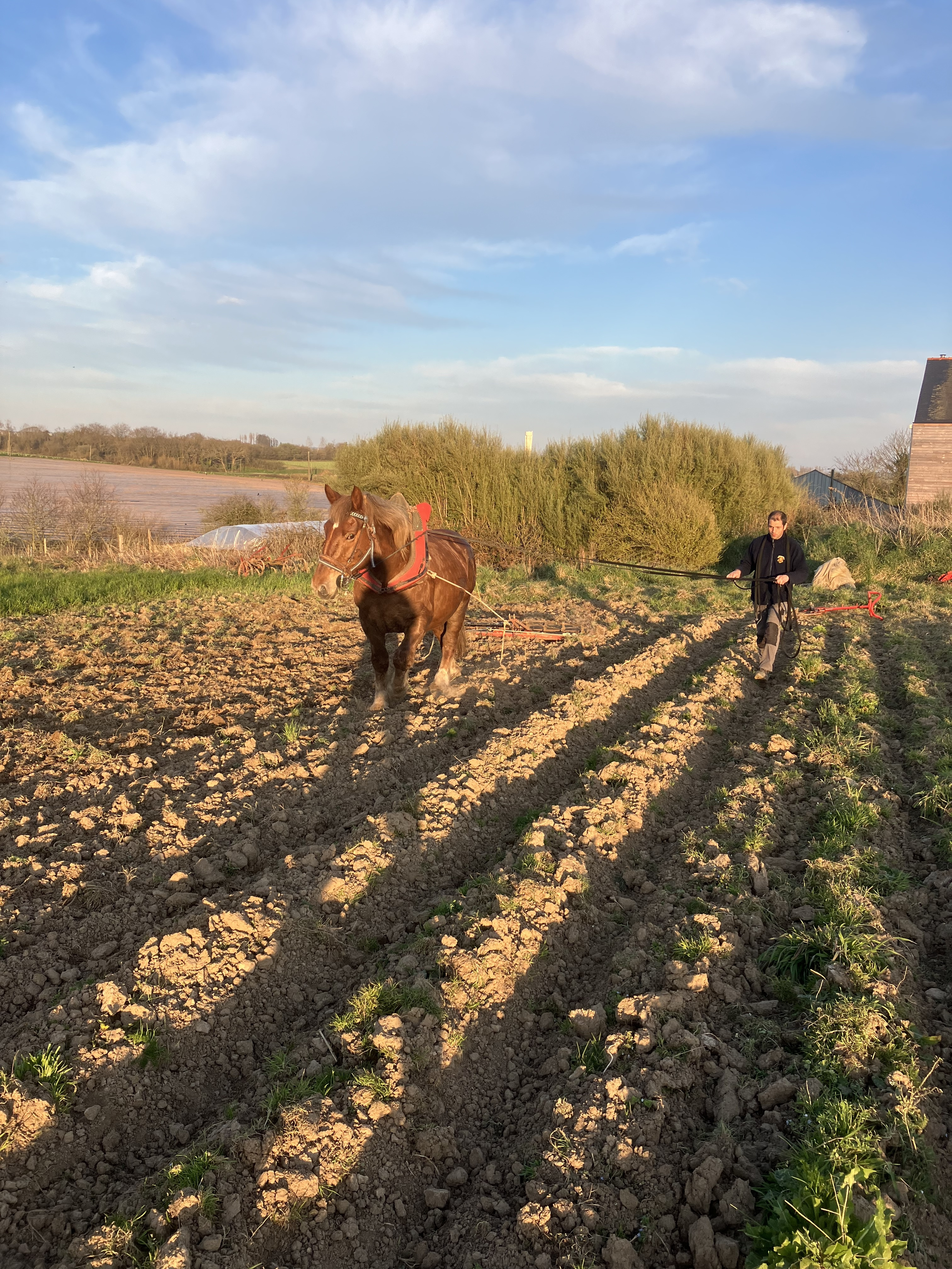 Notre projet s’inscrit dans une démarche biologique, respectueuse des sols et du vivant. Nous cultivons nos terres en traction animale avec deux juments, Altesse et Bretagne, ainsi qu’un âne du Poitou, Ulysse et son fils Merlin. Comment ça marche ?